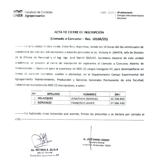 Fecha de inscripción: del 17 al 23 de septiembre, de 8.00 a 18.00hs en la Ofina de Personal de la FCA-UNER.