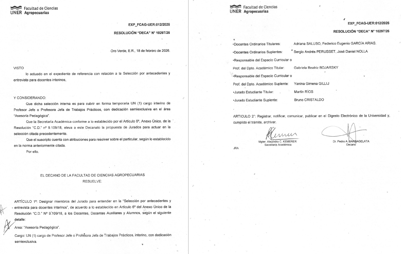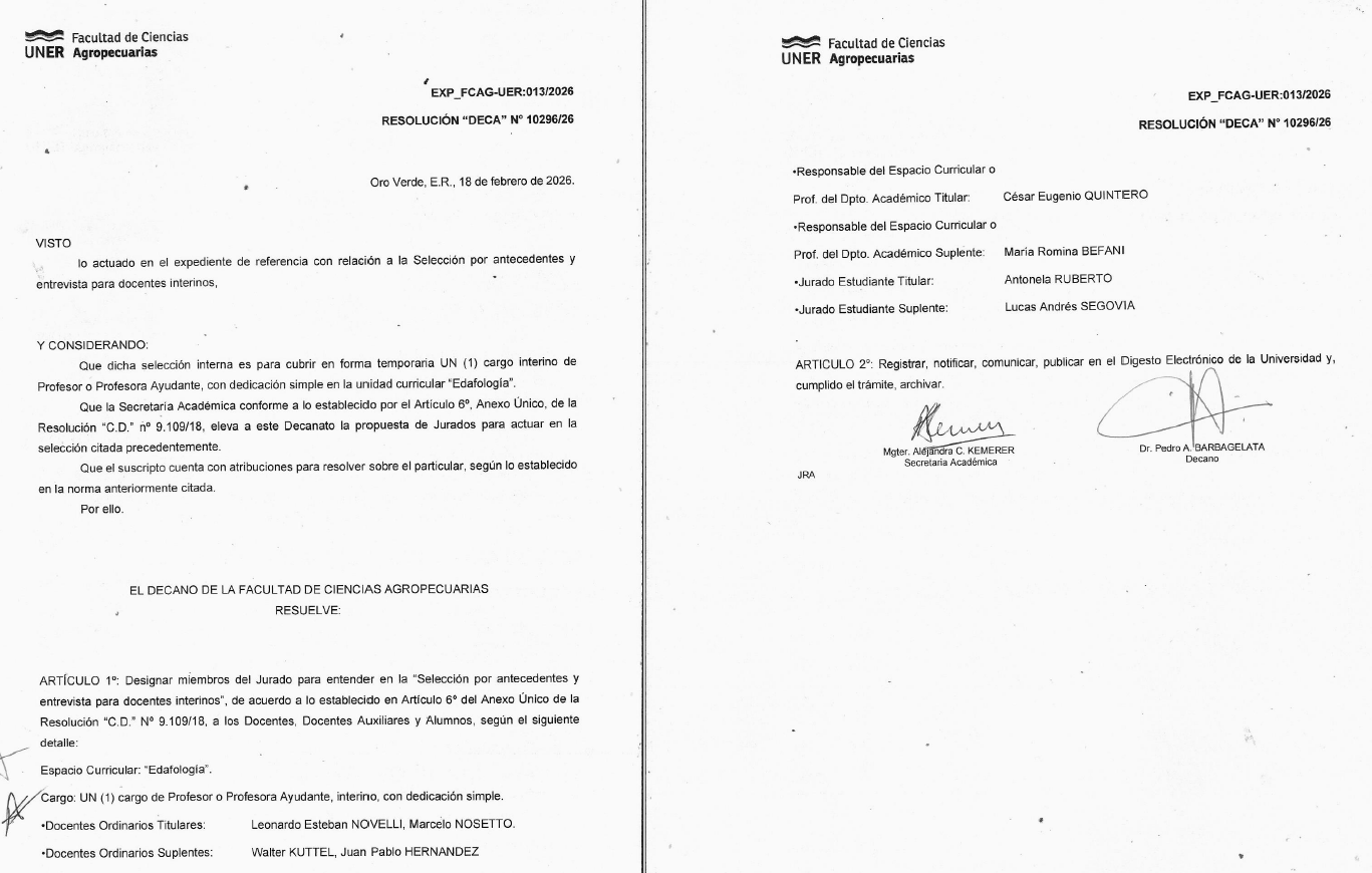 El Decano designó el jurado para actuar en las selecciones docentes para cubrir cargos Interinos en «EDAFOLOGÍA» y en el área «ASESORÍA PEDAGÓGICA».