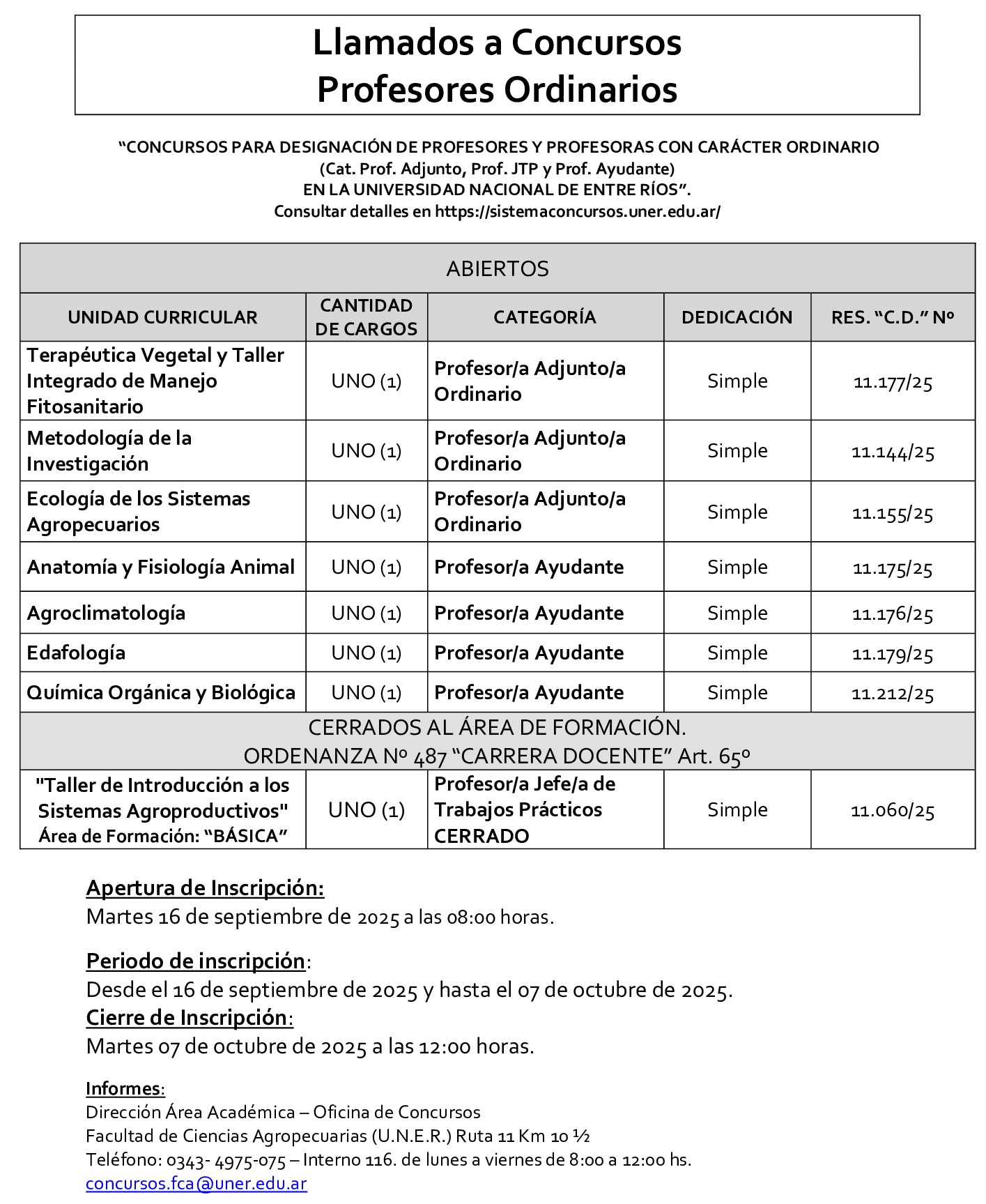 Para mayor información escribir al correo concursos.fca@uner.edu.ar o acercarse a la Oficina de Concursos de lunes a viernes, de 8:00 a 12:00 hs.