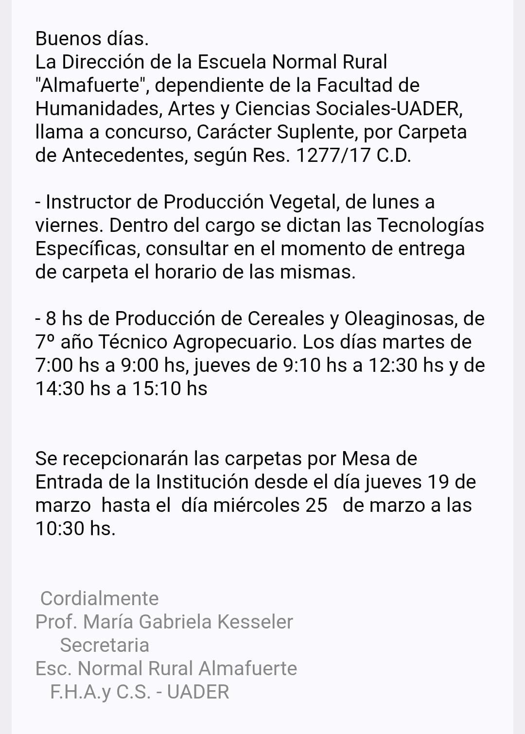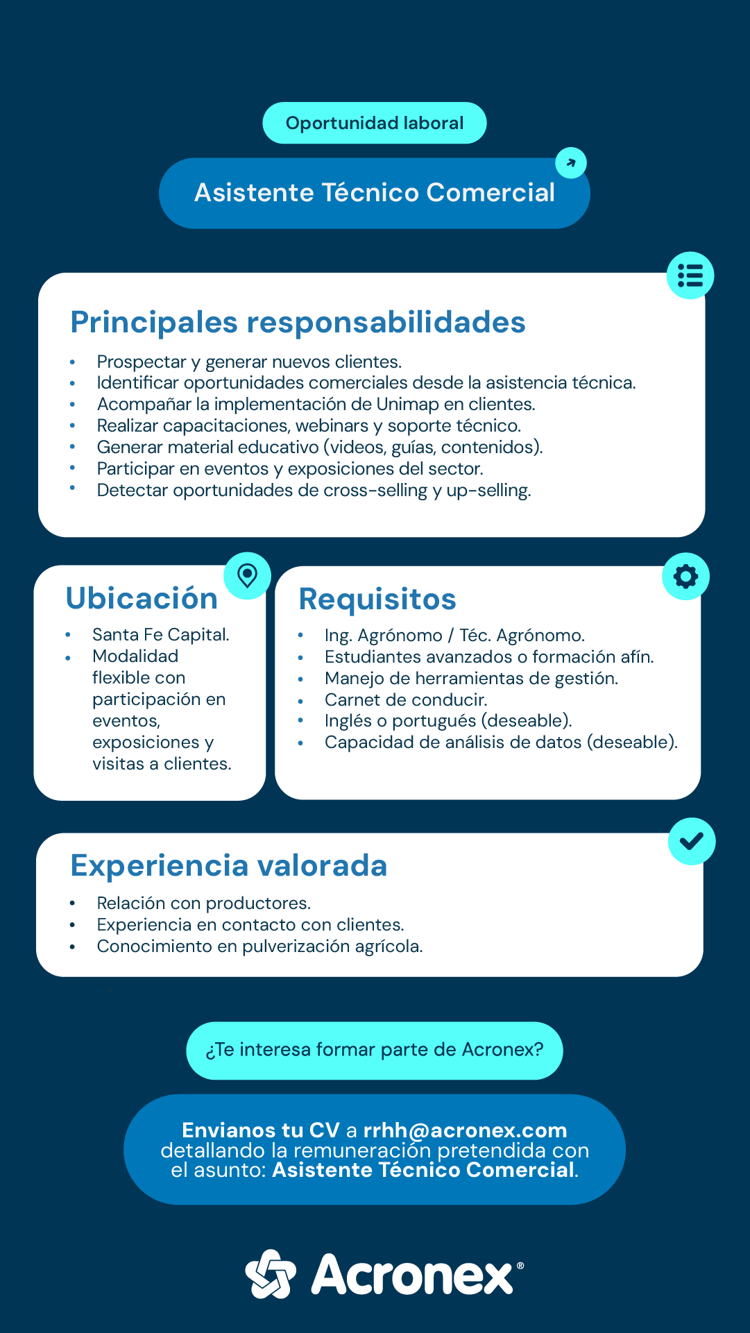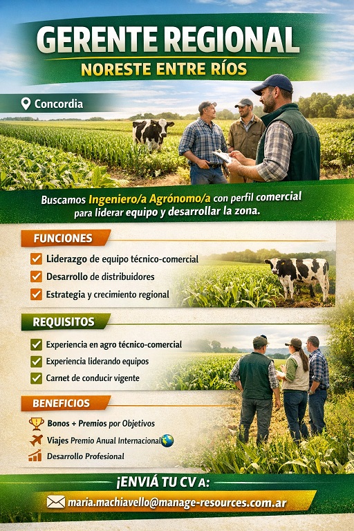 Publicado: 20/3/26 Ing. Agr. o estudiantes próximos a graduarse / Comercial Santa Elena MÁS INFORMACIÓN Publicado: 19/3/26 Cargos docentes en la Escuela Almafuerte La Picada MÁS INFORMACIÓN Publicado: 18/3/26 Ingeniera/o Agrónoma/o con perfil comercial Concordia MÁS INFORMACIÓN Publicado: 16/3/26 Pasantía rentada - sector agropecuario en los Estados Unidos Vacante cría de vacas - Más información MÁS INFORMACIÓN Publicado: 16/3/26 Asesor Técnico comercial Villaguay, La Paz, Diamante, Victoria o Gualeguay MÁS INFORMACIÓN Publicado: 12/3/26 Representante Técnico comercial Rosario MÁS INFORMACIÓN Publicado: 10/3/26 Asistente Técnico comercial Santa Fe, Capital MÁS INFORMACIÓN