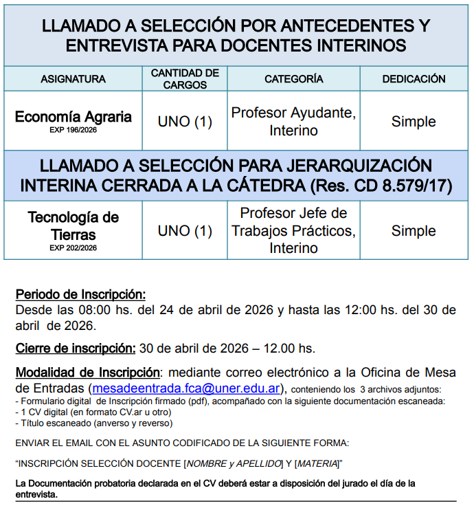El 24 de abril abre la inscripción para participar de una selección docente para cubrir un cargo Interino de Prof. Ayudante, simple en la unidad curricular «ECONOMÍA AGRARÍA» de la carrera Ing. Agr. Además se abrirá un llamado cerrado a la cátedra «TECNOLOGÍA DE TIERRAS» que, conforme a la Res. CD 8.579/17, y debido a la pluralidad de candidatos a cubrir la vacancia, se limitará a los integrantes que revisten en la categoría inmediata inferior de la unidad curricular.